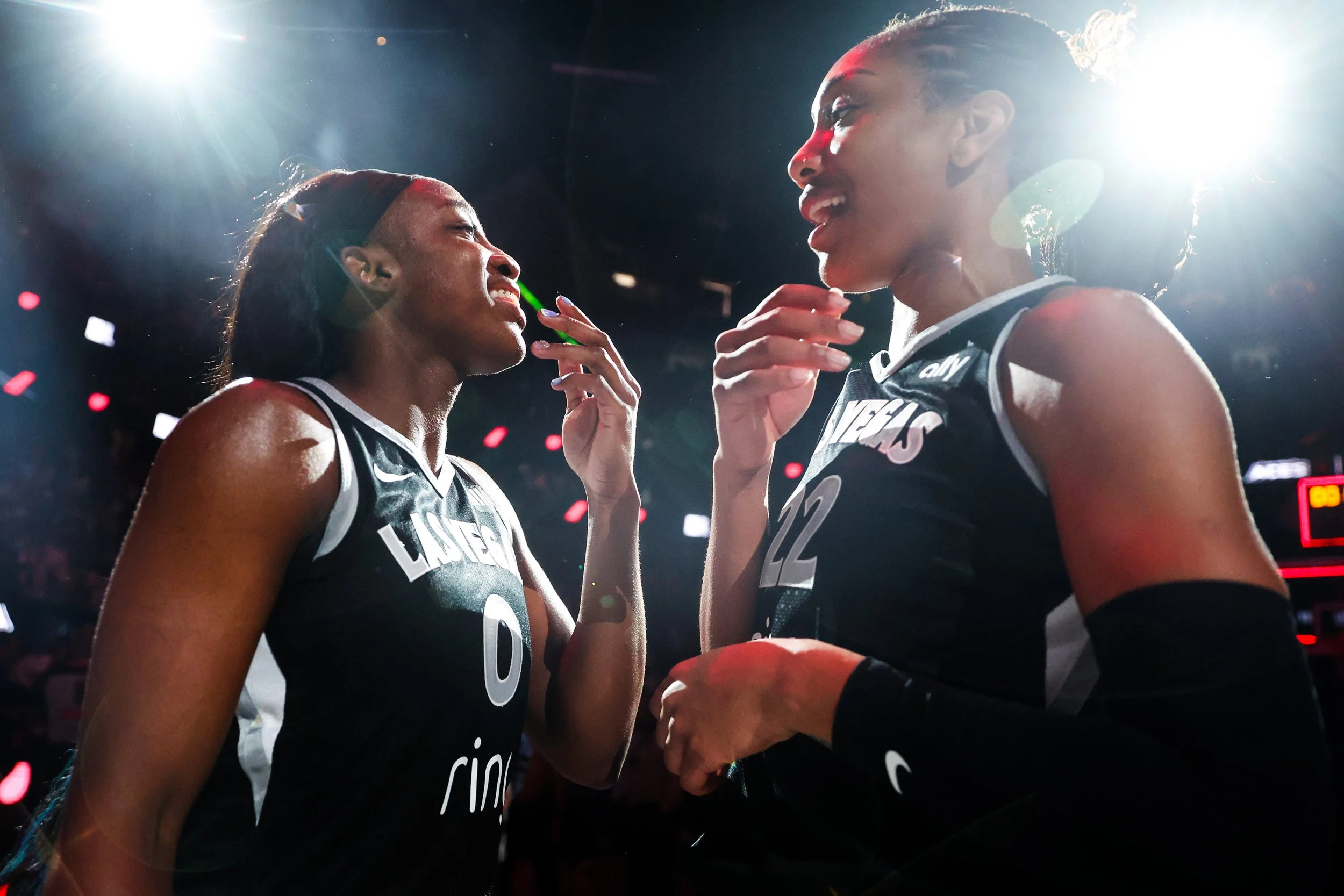 Aces center A'ja Wilson (22) and Aces guard Jackie Young (0) chat after a WNBA basketball game between the Aces and Indiana Fever at T-Mobile Arena on Sunday, June 22, 2025, in Las Vegas.